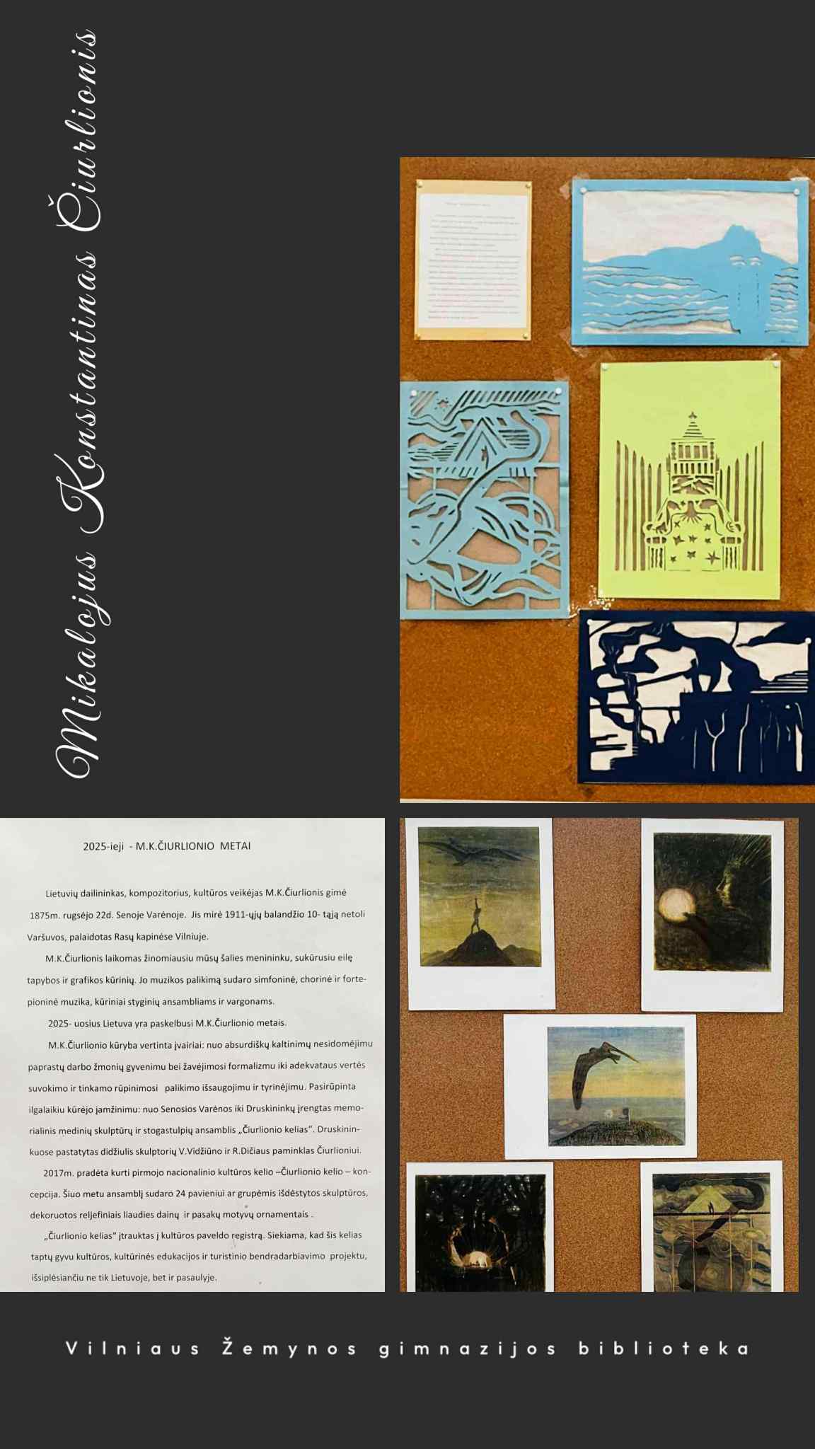 Pažvelkime į paveikslus… Juose kiekvieną kartą įžvelgsime ką nors nauja. Juk tai M. K. Čiurlionis! Sutelkę dėmesį – išgirsime ir muziką. Dėkojame mokiniams, kurie sugeba taip juvelyriškai iškarpyti karpinius, ir mokytojai Danutei Trečiokienei, kuri mielai pasidalina darbeliais su biblioteka.