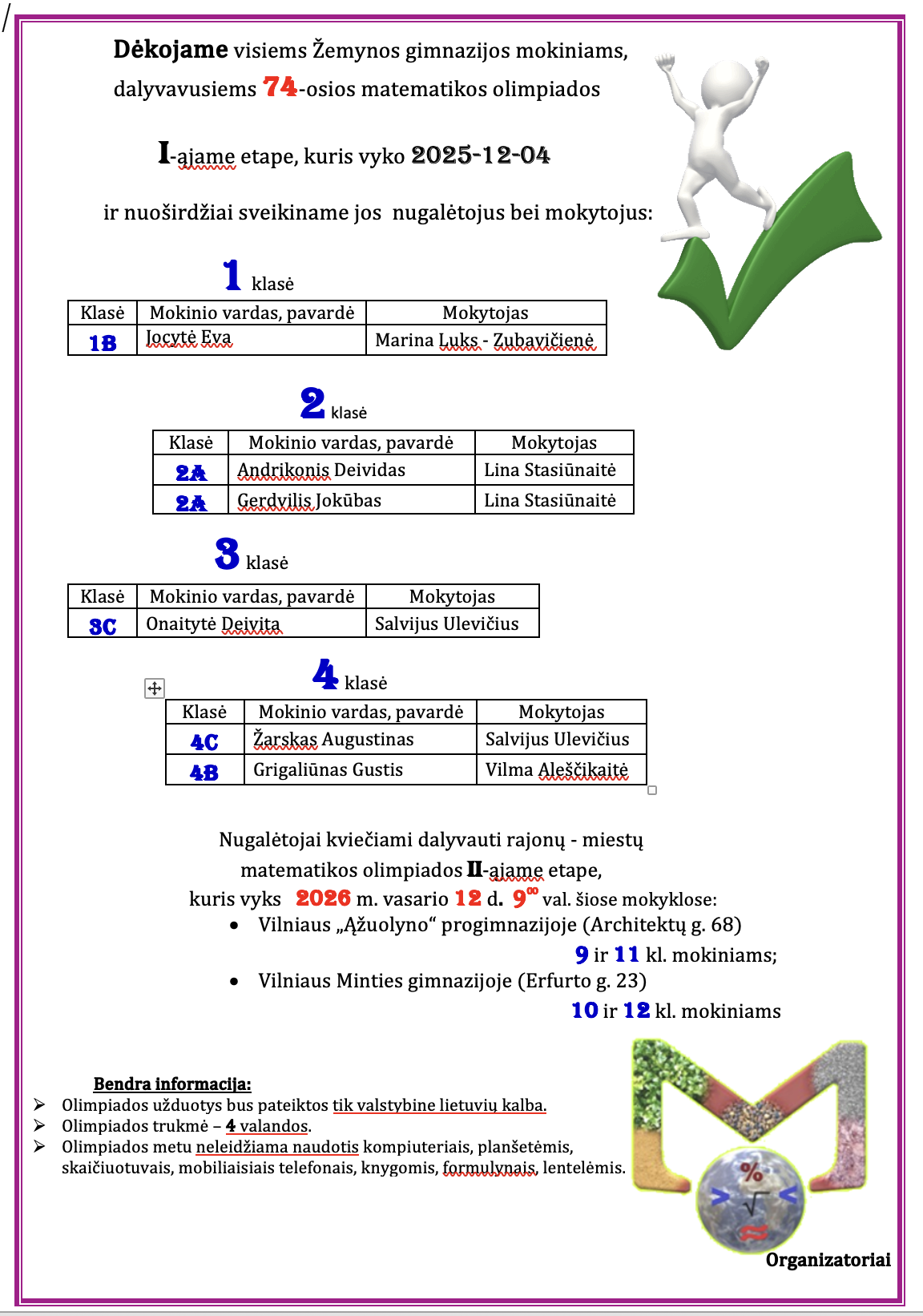 2025 m.  gruodžio 4 d. mūsų gimnazijoje vyko 74-osios  matematikos olimpiados  I-asis etapas.Matematikos olimpiada – tai intelektualus konkursas moksleiviams, siekiant išbandyti ir pagilinti matematikos žinias, lavinti loginį mąstymą sprendžiant