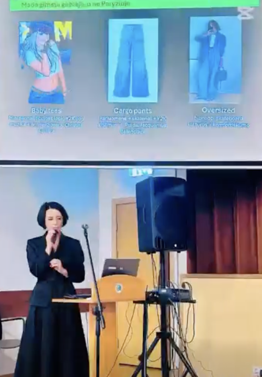 Lektorė kalbėjo apie greitąją madą, masinę drabužių gamybą ir apie tai, kaip gimsta pati mada. Iš kur mes sužinome, kas šiuo metu „ant bangos“? Kaip socialiniai tinklai formuoja mūsų pasirinkimus ir visuomenės įvaizdį?